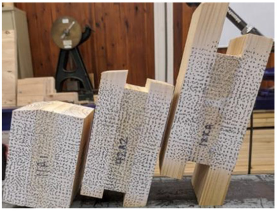 Plantation grown hybrid southern pine (a hybrid between Pinus elliottii and Pinus Caribaea) was used to manufacture 45 specimens in total with a cross section of 135 × 30 mm and a 56.6 mm projection length; three groups of specimens with 15 for each target EMC were considered for investigation. The tested specimens had an average MOE of 9790 MPa and were conditioned to 3 different environmental conditions to achieve approximate EMC, i.e., 8%, 12% and 16%. These conditions were 23 °C and 45% RH (for target EMC of 8%), 20 °C and 60% RH (for target EMC of 12%), and 25 °C and 80% RH (for target EMC of 16%). Samples were manufactured and conditioned for a period of 2 weeks and their mass monitored until a constant mass was achieved and the samples assumed to be conditioned to the respective EMC.