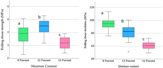 Boxplot showing effect of moisture content on RS strength (left) and modulus (right) of southern pine. The square in the boxplots shows the mean and different letter are from LSD test in the boxplots indicating the means between groups are significantly different (p-value equals 0.05).