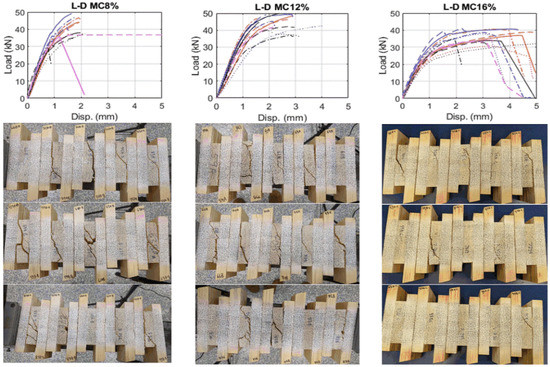 The load vs displacement curves for EMC associated with 8, 12 and 16% are illustrated in Figure 6 where the curves presented display the individual test specimen loading curves for each EMC group. As evident in the plot, higher moisture content alters the behaviour of failure by making the sample behave in a more ductile manner. The non-linear part of the curve for an EMC of 16% is longer than their 12 and 8% counterparts. As a result, more displacement can be observed as moisture content increases from 8 to 16%.