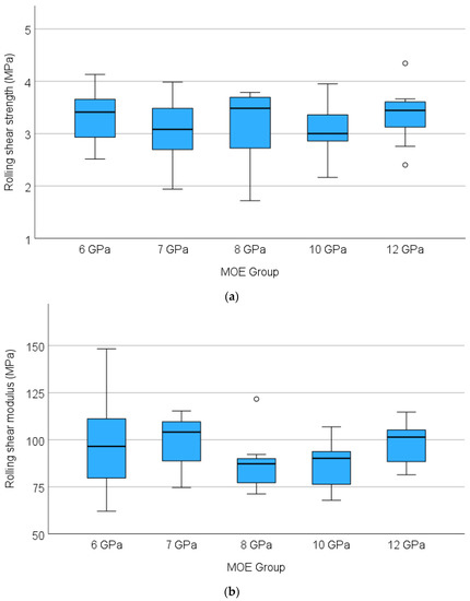 The box and whisker plot for RS strength is depicted in Figure 7. The mean RS strength of the five MOE groups were found to be within the range of 3.05–3.36 MPa. Relevant characteristic values are 2.55, 2.03, 2.23, 2.33 and 2.65 for 6, 7, 8, 10 and 12 GPa MOE, respectively, showing an average RS strength of 2.36 MPa. The mean RS moduli of the five MOE groups were within the range of 85.65–98.87 MPa. One outlier data point associated with the 8 GPa group was discarded for the calculation of the mean value. The 5th percentile/characteristic RS modulus are 66.39, 75.57, 72.46, 68.97 and 83.75 MPa for 6, 7, 8, 10 and 12 GPa MOE, respectively, with an average modulus value of 73.43 MPa.