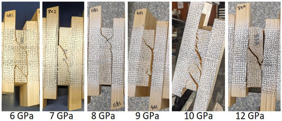 The failure modes of each of the MOE grouping for the southern pine samples were visually assessed and found there were some variations in the mode types between MOE groups. The lower grade 6 and 7 GPa samples produced several fracture lines. Furthermore, MOE groups of 8, 9 and 10 GPa produced consistent failures likened to a typical RS failure mode with minimal or single fracture lines. The 12 GPa MOE group produced the one fracture line after testing, the point of failure would initiate as RS but then propagate through to an interface separation. Post-inspection of the samples indicated this was not a glue line failure but a failure in tension perpendicular to the face grain of the projection boards. Figure 8 presents an example of the observed failure modes across the 6 tested MOE groupings.