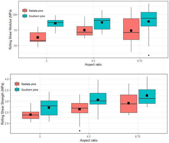 Figure 10 shows the box and whisker plots of the RS strength and modulus. As discussed above, an increase in mean RS strength is observed with an increased AR. The same trend, i.e., increase in mean RS modulus with increased AR can be seen in Figure 10a. It is noted that there was an outlier value obtained for AR 6.75 and the mean value is calculated by discarding the outlier. Nevertheless, the increase in slope for RS modulus is significantly less than RS strength. The 5th percentile values for RS strength related to AR of 3, 4.5 and 6.75 were 2.18, 2.33 and 2.82 MPa, respectively, whereas the same for RS modulus were found to be 72.28, 68.97 and 57.83 MPa, respectively. Therefore, the characteristic (5th percentile) RS strength is still showing an increasing trend with respect to AR. In contrast, the characteristic value for RS modulus exhibits an inverse relationship. Considering the p-value (Table 7), slope of the fitted line (Figure 10) and 5th percentile, it can be concluded that the effect of AR on RS modulus is negligible. The same conclusion can be made for radiata pine samples (Figure 10).