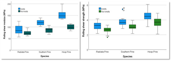 It is important to note that samples with sound centred knots did not affect the shear properties in a negative way but showed some improvements in both strength and modulus regardless of species, as shown in Table 8 (knots). Characteristic RS strength (modulus) for radiata, southern and hoop pine were 2.18 (79.42), 2.70 (109.06) and 2.60 (147.32) MPa, respectively. Figure 15 shows the box-and-whisker plots of obtained RS strength and RS modulus (Figure 15) for samples with and without knots.