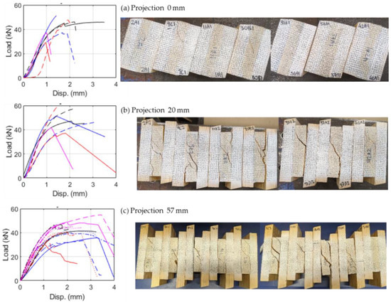 Load vs displacement curves, and relevant failure modes of the samples due to various projection length.