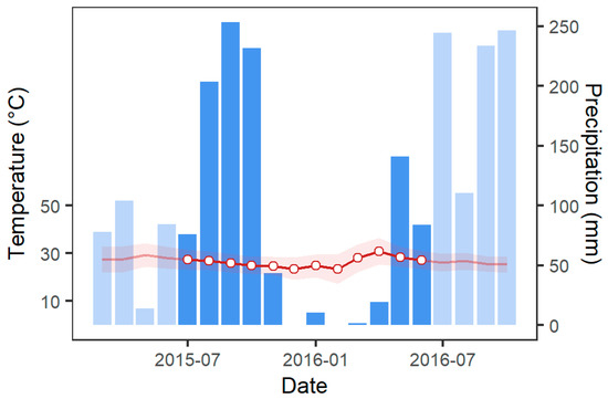 Climate chart of the study site based on measurements between January 2015 and December 2016. Darker bars and points correspond to times of soil respiration measurement.