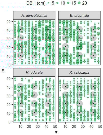 The non-native A. auriculiformis and E. urophylla grew faster than the native species, as indicated by the larger basal area and the higher mean annual diameter increment. In contrast, the growth rates and stem sizes of X. xylocarpa were smaller, indicating lower productivity. The stem maps show empty rows or patches in all stands except for A. auriculiformis, indicating that the reduction in stand density from the initial 1250 seedlings ha−1 was mainly driven by seedling mortality and less by self-thinning processes (Table 1).