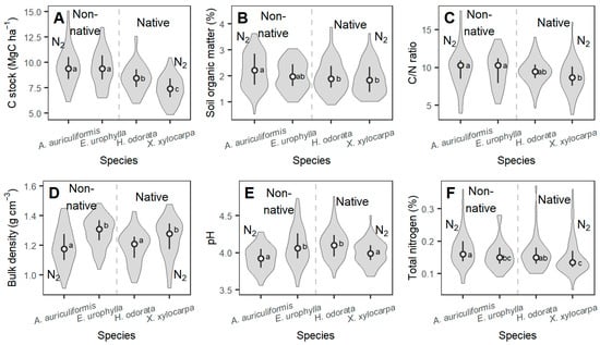 Comparison of soil conditions across the four tree species: (A) carbon stock, (B) soil organic matter (SOM), (C) C/N-ratio, (D) bulk density, (E) pH, and (F) total nitrogen. The dot represents the median value, the vertical lines represent the interquartile range (IQR), and the widths of the violin plots indicate the density of observations at each level. Letters represent significant differences between medians, as determined by Dunn’s test (p < 0.05).