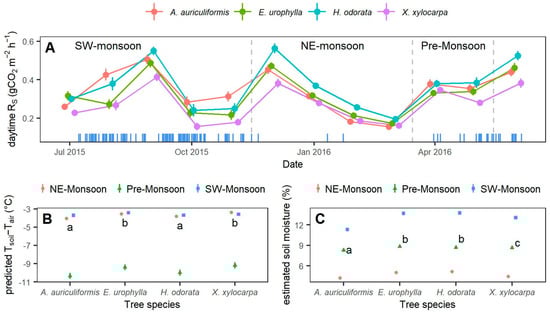 Soil respiration varied significantly between, but also within, the three seasons (Figure 4A). All species showed reduced soil temperatures relative to air temperature, especially during the pre-monsoon season, which is the hottest time of the year (Figure 4B). Cooling effects were significantly higher in A. auriculiformis and H. odorata stands (p < 0.05). In contrast, soil moisture levels were higher in E. urophylla and H. odorata (p < 0.05) stands, revealing a unique soil microclimate in each stand, depending on the dominant tree species (Figure 4C).