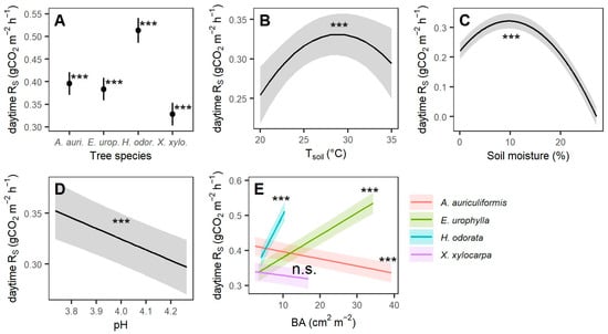 Estimated relationship between hourly rates of soil respiration (RS) during daytime and the marginal effects of the mixed-effects model, specifically tree species (A), soil climatic conditions (B,C), soil pH (D), and local basal area (E). The solid line represents the fitted curve, while the shaded area represents the 95% confidence interval. Significance stars represent p-value (*** p < 0.001; n.s. p > 0.05). See Table A2 for a tabular description of the model estimates.