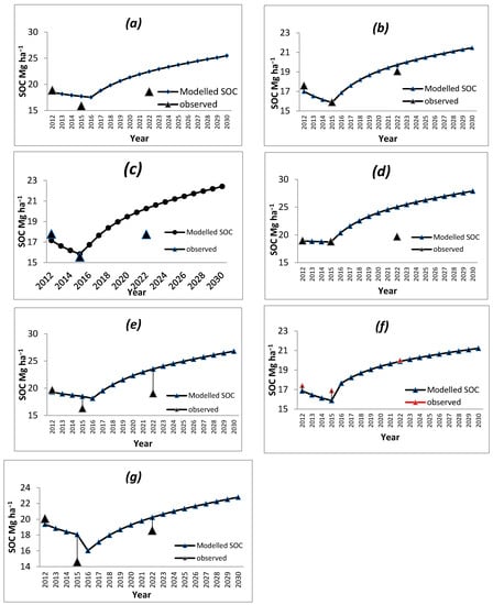 Various soil models (Q, ROMUL, RothC, SoilCO2/RothC, and Yasso07) and plant–soil models (CENTURY, Coup-Model and Forest-DNDC) have been used for studying soil carbon stock dynamics. Management, fertilization, crop rotation [15,16], and climate change [17] have been incorporated into different simulation models for predicting long-term changes in SOC [18,19,20,21]. The availability of input data, their simplicity, and whether modelled and measured values are good or unsatisfactory dictates the use of these models [22].