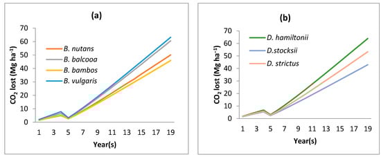CO2 evolution under a usual scenario in (a) Bambusa species and (b) Dendrocalamus species.