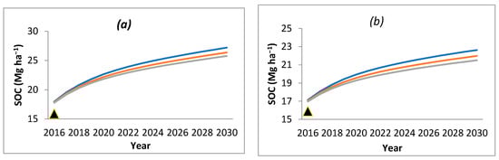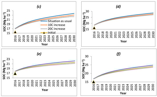 By modeling the scenario of the impact of a likely increase in temperature, it was found that SOC decreases with an increase in temperature (Figure 4). Climate factors, such as precipitation and temperature, significantly affect SOC content which is the basic component of the global carbon cycle, particularly in the context of climate change [50,51,52,53]. Under climate change scenarios, most studies [54,55] have reported losses from the soil organic carbon. Increased temperatures might enhance the release of CO2 to the atmosphere from SOC. Temperature increases will accelerate decomposition and, consequently, increase the loss of SOC stock in the upper layer of the soil [56]. As reported by Xu et al. [57] using the RothC model, results indicated that SOC stock would decrease by 2%–6% over 40 years under the climate change scenarios in the rangelands of southern Ireland. Using the CarboSOIL model, Muñoz Rojas et al. [55] also showed that climate change had a negative impact on SOC contents in the upper layers of the soil section in Andalusia. Jebari et al. [51], also using the RothC model, predicted that SOC content will decrease in the different climate change scenarios in comparison with no climate change scenario for future decades overall in Spain.