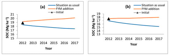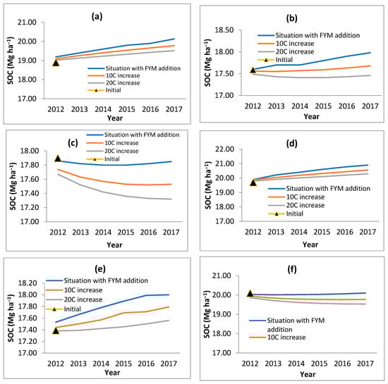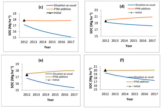 RMSE values with the RothC model are reported in the range of 2%–30% [21,23,34,35,36,37,38,39,40,41,42,43,44,45,46,47,48,49,50,51,52,53,54,55,56,57,58,59,60,61,62]. EF was −20.32 to 0.94. González-Molina et al. [63] also reported an EF range from 0.32 (grasslands) to 0.90 (forests) and concluded that RothC performs better in agriculture and forest land compared to grasslands and rangelands. Barančíková et al. [64] reported that the RothC modeled and observed values are fairly close to each other, and RothC is a good model for the prediction of SOC. The model simulated an increase in CO2 with an increase in temperature and application of FYM (Figure 6). The increasing temperature will expedite the decomposition of soil organic matter and tend to increase SOC loss in the future.