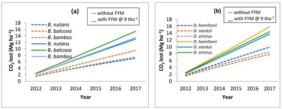 The observed data for all the bamboo species and consequently modeled data for the corresponding period revealed that in the initial stages of bamboo plantation, SOC reduces. Through the RothC model, it was ascertained at what rate organic manures (farm yard manures; FYM) should be applied to the bamboo so that the SOC levels do not reduce and are retained to the near-original SOC values. Different rates of FYM application (@ 5 t ha−1, 7 t ha−1, 8 t ha−1, and 9 t ha−1) were modeled, and it was observed that FYM applied @ 9 t ha−1 helps in maintaining the initial SOC level (Figure 5). However, this will also result in an increase in CO2 (Figure 6).