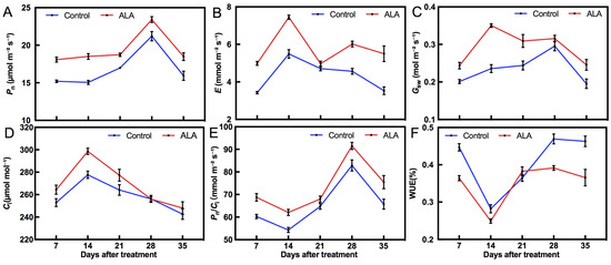 Effect of ALA treatment on photosynthetic gas exchange parameters of nectarine leaves. (A) Pn, net photosynthetic rate. (B) E, transpiration rate. (C) Gsw, stomatal conductance to water vapor. (D) Ci, intercellular CO2 concentration. (E) Pn/Ci, instantaneous carboxylation efficiency. (F) WUE, water use efficiency. The data are the means ± standard error of twenty biological replicates.