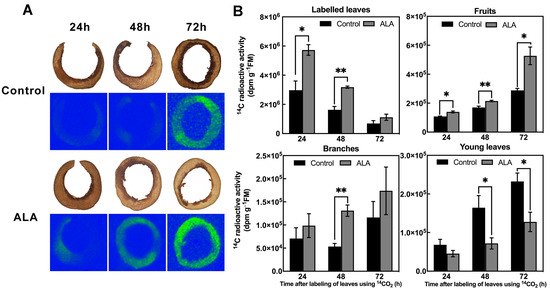 Figure 2A shows the results of radioactive autoradiography of ‘Zhongai 33’ peach fruits, whose leaves were fed with 14C label. Among them, the blue part of Figure 2A is the natural background, and the green part is the 14C radiolabel. The stronger the radioactivity, the greener the color is. It can be seen that the intensity of fruit radioactivity gradually increased as the time of leaf 14C labelling was prolonged (Figure 2A). At 24–48 h, a small amount of radiolabeling could be seen in the control; at 72 h, the radiolabeling increased substantially, indicating that the photosynthates were transported from the labelled leaves to fruits within 1–2 d, which was increased substantially by the third day. Exogenous ALA treatment significantly promoted the transport of 14C from leaves to fruits. At 24 h, the autofluorescence image of the fruit was vaguely visible, whose basic outline could be observed at 48 h, and the complete outline could be clearly seen at 72 h. These indicate that ALA treatment promoted the transport of assimilates from leaves to fruits.
