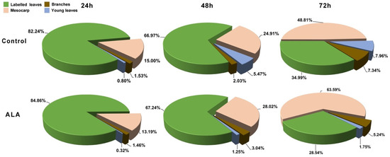 The results in Figure 3 show that at 24 h after leaf 14C labeling, 82.59% of radioactive substances were present in leaves, while 15.07% were transported to the fruits, and 0.81% and 1.53% were distributed in young leaves and branches, respectively. Subsequently, the percentage of radiolabeled compound distribution in the leaves decreased rapidly but increased rapidly in other parts. By 72 h, only 35.30% were present in leaves, while 49.26% were in fruits. The percentages of branches and young leaves continued to increase; however, they were significantly lower than the “source” leaves. The distribution of 14C indicates that only about 1/3 of the assimilates were retained in the mature leaves; about ½ were transported to the fruit, and a smaller portion to the upper young leaves. A similar situation was found in ALA-treated plants. At 24 h after 14C labelling, most of the radiolabeled compounds were present in the leaves; as the time increased, the percentage of 14C assimilates in the labelled leaves gradually decreased, but increased in other parts. ALA treatment significantly promoted the distribution of 14C assimilates to the fruits, about 15 percentage points higher than the control at 72 h. At the same time, the percentage of self-retaining in labelled leaves, branches, and young leaves decreased by 6.52, 2.11, and 6.26 percentage points, respectively.