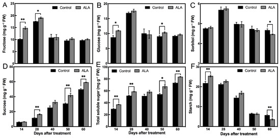 Effect of ALA treatment on the sugar content during nectarine development. (A) Fructose content. (B) Glucose content. (C) Sorbitol content. (D) Sucrose content. (E) Total soluble sugar content. (F) Starch content. The data are the means ± SE from three biological replicates. Bars with * indicate the differences significant according to t-test. (* p < 0.05, ** p < 0.01).
