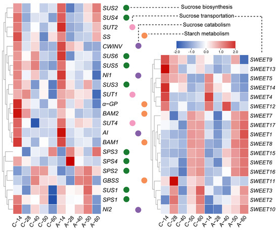 Effect of ALA treatment on the relative expressions of the sugar-related genes during nectarine development. C-14 to C-60 and A-14 to A-60 represent the fruit samples collected 14 to 60 days after spraying clear water and ALA, respectively. The color gradient from blue to red corresponds to fold changes from low to high.