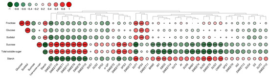 Sucrose or total sugar content was significantly positively correlated (p < 0.05 or 0.01) with the relative expression of nine genes, including SWEET1/6/7/8/10/15/16/17 and SPS3. It was significantly negatively correlated with the relative expression of seven genes, including SUT1, SUS3/5, CWINV, SWEET5/14, BAM1/2, NI1, and α-GP. Starch content was significantly positively correlated with the relative expression of six genes, including SUT1, SUS5, SWEET5, CWINV, NI, and α-GP, while it was significantly negatively correlated with the relative expression of eight genes, including SWEET1/6/7/8/10/15/16/17. The glucose content was positively correlated with SPS4 only; fructose content was positively correlated with the relative expression of SUT1 and SPS4 and also negatively correlated with SWEET7 expression. Sorbitol was similarly positively correlated with SPS4 and negatively correlated with SWEET7.