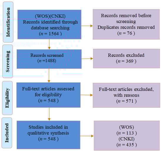 To identify relevant studies, a literature search was conducted based on the China National Knowledge Infrastructure (CNKI) and Web of Science (WOS) databases. To ensure the timeliness of the number of publications, the search date was on 31 December 2022. Figure 1 shows the process of the literature search and screening.