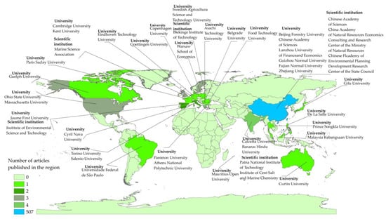 The breakdown of the institutions and nations described in the study (owing to space limitations, only institutions in China with more than seven publications are marked).