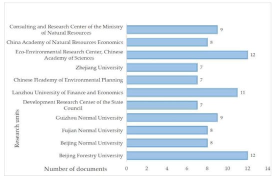 Owing to the large number of issuing institutions, the number of institutions with more than seven articles was counted(Figure 4). Results of the statistical analysis show that the institutions with more than seven articles are all from China and that the top units in the number of publications in China are mainly divided into three categories: first, the scientific research units that have been engaged in ecological environmental protection and sustainable development for a long time include: the Environmental Planning Institute of the Ministry of Ecology and Environment (seven articles), the China Institute of Natural Resources Economics (eight articles), Development Research Center of the State Council (seven articles), and the Consulting and Research Center of the Ministry of Natural Resources (nine articles); second, the units in the regions where the national eco-product value realization mechanism points are located include: Zhejiang University (seven articles), Fujian Normal University (seven articles), Guizhou Normal University (nine articles); and, third, the unit whose research objects are mainly finance and resources, such as: Lanzhou University of Finance and Economics (eight articles). In addition, the colleges and universities related to forestry and agriculture are also the main publishing units, such as Beijing Forestry University (twelve articles), Eco-Environmental Research Center, Chinese Academy of Sciences (twelve articles), etc. In general, the article distribution for the research institutions is affected by factors such as research foundation and experience, geographical advantages, and majors.