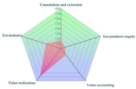All of the identified literature is classified and summarized from the aspects of connotation and expansion, supply of eco-products, value accounting of eco-products, value realization of eco-products, and eco-industry (Figure 5). The literature on eco-product value realization accounts for 49.42%, mainly including eco-product value realization paths, models, and mechanisms. Eco-industry literature accounts for 21.82%, and mainly concerns technology research and development, industrial model construction, and experimental demonstration in eco-industry. The connotation and extension, and the value-accounting literature account for 12.28% and 11.27%, respectively. These are mainly about the concept and connotation of eco-products, value composition of eco-products, value-accounting indexes and methods, etc. The literature on the supply of eco-products accounts for 5.20% and mainly concerns the innovation of supplying the main body model, landscape planning, and so on. These proportions in the literature indicate that research on the value realization of ecological products and eco-industries is becoming more mature, while the supply and value accounting of eco-products are still in the exploratory and developmental stages.