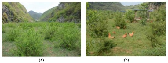 Rocky desertification control derivative industry in Guizhou: (a) prickly pear-planting industries; (b) under-forest chicken-raising (source: https://sck.gznu.edu.cn/erji.jsp?urltype=tree.TreeTempUrl\&wbtreeid=1773 (accessed on 23 October 2022)).