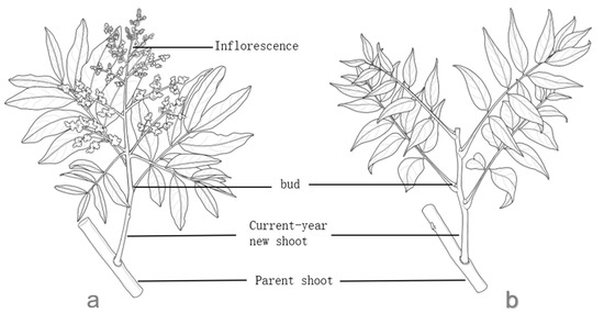 Schematic of the current-year new shoots on parent shoot. (a) bearing shoot of the current-year new shoot; (b) vegetative shoot of the current-year new shoot.