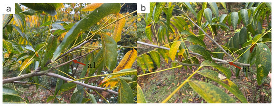Types of Sapindus mukorossi parent shoots. (a) The parent shoots that developed from bearing shoots (type F), (a1) persistent infructescence of bearing shoot of previous year; (b) the parent shoots that developed from vegetative shoots (type V), (b1) top of vegetative shoot of previous year.