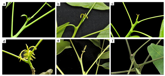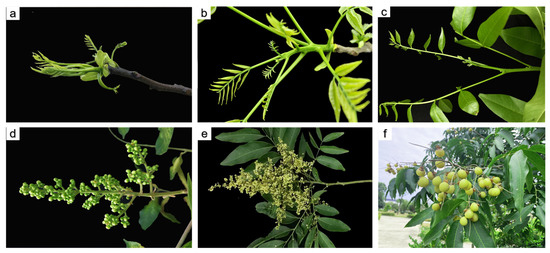 Developmental dynamics of bearing shoots. (a) bud sprouts and leaf-spreading stage; (b) new shoot continues to grow and develop, and the apical growth point continues to grow; (c) inflorescence sprouts on the top of new shoots; (d) inflorescence continues to grow and develop; (e) inflorescence flowering; (f) infructescence.
