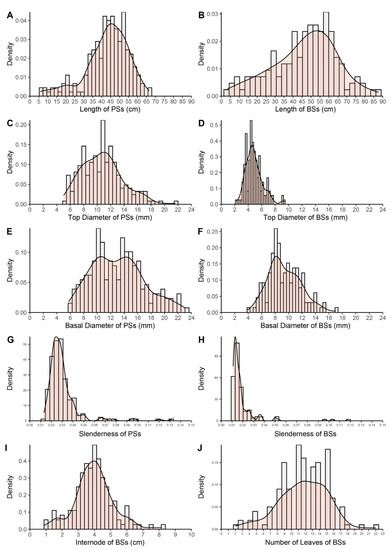 The length of BSs ranged from 3 to 87.7 cm, with the highest frequency in the range of 30.1 to 69 cm. Moreover, the top diameter of the BSs ranged from 2.25 to 9.4 mm, with the highest frequency in the range of 3.4 to 5.8 mm. The basal diameter of the BSs ranged from 3.92 to 16.99 mm, with the highest frequency in the range of 6.1 to 12.4 mm. Additionally, the slenderness of the BSs ranged from 0.011 to 0.118, with the highest frequency in the range of 0.01 to 0.024. Then, the number of leaves of the BSs ranged from 2 to 22, with the highest frequency in the range of 8 to 16, and the internodal length of the BSs ranged from 0.9 to 8.16 cm, with the highest frequency in the range of 2.8 to 5.2 cm.