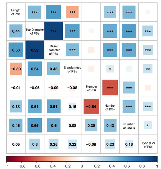 Correlations among the properties of the “Yuanhua” Sapindus mukorossi parent shoots. Note: Length of PS, length of the parent shoot; Top Diameter of PS, the diameter of the tip of the parent shoot; Basal Diameter of PS, the diameter of the base of the parent shoot; Slenderness of PS, the slenderness of the parent shoot; Number of VSs, the number of vegetative shoots on parent shoots; Number of BSs, the number of bearing shoots on parent shoots; Number of CNS, the total number of current-year shoots on parent shoots; Type (FV) of PS, the types of parent shoots. Asterisk in the figure are p-values and represent statistical significance (* p < 0.05, ** p < 0.01, *** p < 0.001).