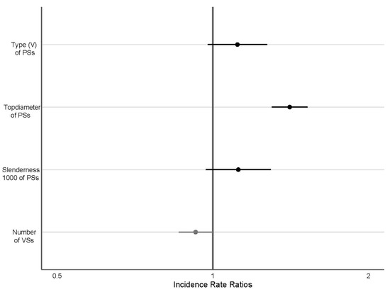 The total yield of a single PS was used as the dependent variable, and the length of the PS, top diameter of the PS, basal diameter of the PS, slenderness of the PS, type (F or V) of the PS, number of BSs, number of VSs, and the number of CNS were used as the independent variables; the sampling year and sampling tree were used as random factors. Using the zero-inflated GLMM for the analysis, the model was refined based on the AIC value, and the fixed factors of the model only included four variables: the type of PS, top diameter of PS, slenderness of PS, and the number of VSs. The incidence rate ratios (IRRs) of the total yield of a PS are shown in Figure 7 and Table 2. The V-type PS had a positive effect on the total yield of the PS (IRR = 1.12 [>1]), and it did not reach a significant level (p = 0.105); the top diameter of the PS had a positive effect on the total yield of the PS (IRR = 1.12), and it reached a significant level (p < 0.001); the slenderness of the PS had a slightly positive effect on the total yield of the PS (IRR = 1.01 [>1]), and it did not reach a significant level (p = 0.124); and the number of VSs had a slightly negative effect on the total yield of the PS (IRR = 0.93 [<1]), and it reached a significant level (p = 0.046). In contrast, the length of the PS, basal diameter of the PS, number of BSs, and the number of CNSs were not significantly related to the total yield of the PS.