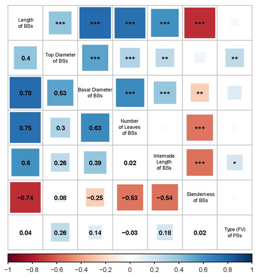 Correlations between each trait for the bearing shoots (BS) and the type of parent shoots for “Yuanhua” Sapindus mukorossi. Note: Length of BS, the length of the BS; Top Diameter of BS, the diameter of the tip of the BS; Basal Diameter of BS, the diameter of the base of the BS; Number of Leaves of BS, the number of leaves of the BS; Internode of Number, the internodal length of the BS; Slenderness of BS, the slenderness of the BS; Type (FV) of PS, the type of parent shoot. * p < 0.05, ** p < 0.01, *** p < 0.001.