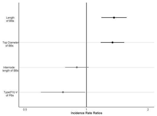 The single yield of the BS was used as the dependent variable; the length, top diameter, basal diameter, number of leaves, internodal length, slenderness, and PS type (F or V) of the BS were used as the independent variables; and the sampling year and sampling tree were used as random factors. The GLMM was used for the analysis and refined based on the AIC values, and the fixed factors of the model were only the length, top diameter, internodal length, and PS type of the BS. The IRRs of the total yield of BSs are shown in Figure 9 and Table 3. The length of the BS had a positive effect on the total yield of the BS (IRR = 1.61 [>1]), and it reached a significant level (p < 0.001); the top diameter of the BS had a slightly positive effect on the total yield of the BS (IRR = 1.26 [>1]), and it reached a significant level (p < 0.001); the internodal length of the BS had a slightly negative effect on the total yield of the BS (IRR = 0.91 [<1]), and it did not reach a significant level (p = 0.107); the V-type of PS had a negative effect on the total yield of the PS (IRR = 0.77 [<1]), and it reached a significant level (p = 0.037). In contrast, the basal diameter, number of leaves, and slenderness of the BSs were not significantly related to the yield of the BS.