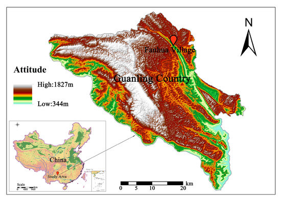 Based on the rural landscape resilience analysis framework of karst areas, this research selected Fanhua village in Guanling County, a typical county of KRDC in South China, as a case study to carry out empirical research and analysis (the specific location is shown in Figure 2). The main part of the village is in the southeast to northwest trend of the peak cluster basin, covering an area of about 6 km2, and the lithology is mainly dominated by limestone. The climate type of the study area is a subtropical monsoon climate that characterized by sufficient heat and rain in the summer; the cumulative average annual temperature, average maximum temperature, and average minimum temperature are 16.2 °C, 16.9 °C, and 15.4 °C, respectively. The annual precipitation is 1205.1 mm, and the average annual humidity is 81%. The terrain of the study area is relatively gentle, and is suitable for the growth of all kinds of vegetation and crops. However, long-term unreasonable land utilization has led to low vegetation coverage and serious soil erosion in the village. In addition, due to the influence of ground and underground dual structures in karst areas, surface water carries an amount of soil that easily leaks into the underground river system, which leads to significant trend of KRD. The local government has curbed the trend of KRD in a timely manner through measures such as mountain closure and forest cultivation, construction of water conservation facilities, vegetation management and protection, scientifically accelerated vegetation restoration, and soil fertility improvements. The village landscape pattern and villagers’ livelihood modes have been significantly improved, providing a good platform for the study of rural landscape resilience assessment in KRDCA.