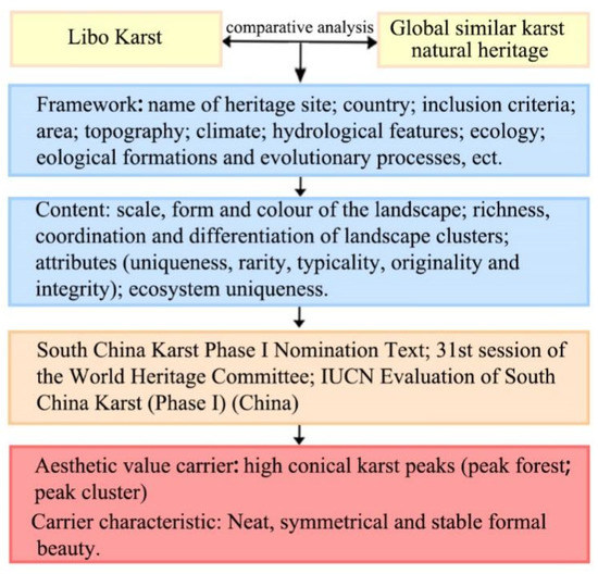 The conservation and sustainable tourism development of natural World Heritage has been one of the most challenging topics worldwide. One topic based on the identification of sites’ outstanding universal value is gradually forming a trend. Aesthetic value as a criteria for WH is an important driving force for the tourism development of most natural World Heritage sites and plays a vital role in the sustainable tourism development of heritage sites. However, due to the subjective consciousness involved in the assessment of aesthetic value, it is difficult to quantify. This means that the content of the protection of the aesthetic value of heritage sites is too general, and the exhibition of aesthetic value is inadequate, posing a threat to the sustainable development of heritage sites. This study selected the Libo Karst Heritage Site as the research area, identified and extracted the carriers and characteristics of the aesthetic value of the Karst heritage site through the combination of online text big data, landscape beauty evaluation, and ArcGIS spatial analysis, and analyzed the content and objectives of aesthetic value protection, clarified the scope of the conversation and tourism exhibits, and, finally, puts forward a conservation and sustainable tourism development strategy based on aesthetic value identification. This study was carried out using interdisciplinary technologies and methods, which provide a valuable reference for the construction of a quantitative evaluation system for the aesthetic value of natural World Heritage sites and the protection of outstanding universal value. This study contributes to filling the research gap regarding the comprehensive evaluation of the aesthetic value and protection and tourism development based on the outstanding aesthetic value identification of natural World Heritage sites. The strategy of cooperation between protection and sustainable tourism development based on prominent universal value recognition can be applied to other forms of conservation and development in other World Heritage sites with similar problems.