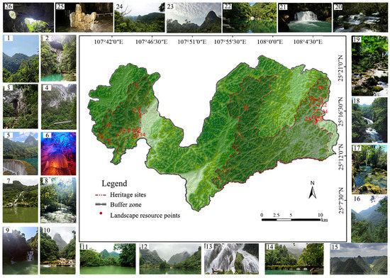 In view of the problems of the unclear identification of the aesthetic value elements of WNHSs, unclear protection objectives and insufficient tourism display, empirical analysis based on case studies is an important scientific issue that urgently needs to be solved [27]. Globally, karst landscapes cover about 12% of the total land area [28], nurturing beautiful natural scenery and constituting a unique and diverse natural landscape with solid ornamental value. The South China Karst provides the best example of karst landforms and natural landscapes, with conspicuous landscape aesthetic value and tourism value [29,30]. However, due to the fragility of the karst environment and the influence of human factors, the environment of the karst area has been damaged to a great extent, resulting in many environmental problems, including rocky desertification [31,32]. Because of the uniqueness, fragility, and complexity of the ecological environment of World Heritage karst sites (WHKSs) [33], it is necessary to identify the aesthetic value carriers and their characteristics, research and explore the conservation based on value identification, and clarify the boundaries of aesthetic value conservation and utilization to achieve the sustainable conservation and development of WHKSs. In this paper, combined with the tutor’s topic, the Libo Karst World Heritage site (hereinafter referred to as “the Libo Karst”), with high aesthetic value and obvious tourism benefits, was selected as the research object. A comprehensive analytical approach was used to identify and extract the aesthetic value carriers of heritage sites and their characteristics, to clarify the content of aesthetic value conservation, to clarify the scope and primary relationship between conservation and tourism, and to propose targeted strategies for heritage site conservation and tourism development.