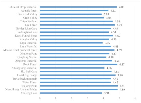 The aesthetic landscape value scores of the 26 core landscape resource sites as measured are shown in Figure 4, with the internal sites ranked from highest to lowest beauty rating: Wolong Pond > Rock Forest > Xiaoqikong Ancient Bridge > 68-level Drop Waterfall > Yuanyang Lake > Tiansheng Bridge > Die Forest > Maolan Karst Primeval Forest > Karst Funnel Forest > Cuigu Wetland > Qinglong Waterfall > Sky Bell Cave > Laya Waterfall > Golden Lion Cave > Water Forest > Turtle back mountain > Qinglong Pond > Kongbu Valley > Jiudongtian Cave > Aquatic Forest > Qinglong Stream > Shuanglong Waterfall > Crab Valley > Latan Waterfall > Yaofeng Cave > Boxwood Valley. Those that exceed the mean value (4.46) or more are considered to be the aesthetic value carriers of the Libo Karst, which can be summarized as water features (Wolong Pond, 68-level Drop Waterfall, Yuanyang Lake, Qinglong Waterfall, Cuigu Wetland Qinglong Waterfall, Laya Waterfall), karst landforms (Tiansheng Bridge, Sky Bell Cave, Golden Lion Cave) and their biological features (Rock Forest, Di’e Forest, Maolan Karst Primeval Forest, Karst Funnel Forest, Water Forest, Turtle back mountain). The above-mentioned aesthetic value carrier monomer or its combination monomer has high integrity, uniqueness, and its landscape aesthetic value is outstanding. Consistent with the description of aesthetic value in the inscription text, “harmonious beauty composed of mountains and forests”. Forests, water, and caves are essential components that constitute the OUV of the Libo Karst.