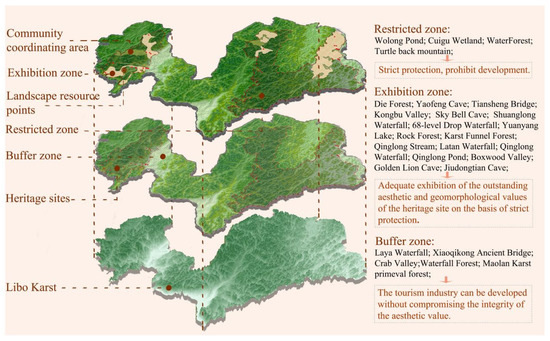 Clarifying the spatial information and information distribution of aesthetic value carriers is key to formulating targeted conservation measures and sustainable tourism utilization. In 2015, in Conservation and Management Plan of South China Karst (hereinafter referred to as “the Plan”), the Libo Karst was divided into a heritage site and a buffer zone. These included strictly protected areas, heritage exhibition zones, and community coordination areas [91]. The Plan can be used to determine the location of each value carrier and other core landscape resource points, clarify their relationship with the existing hierarchical conservation management (Figure 5), and adjust the primary and secondary relationship between the protection and display of aesthetic value to ensure that the integrity of aesthetic value is protected and displayed. The value carrier located in the forbidden area should be a priority for protection, tourism should be restricted, and the value carrier located in the exhibition area must be suitable for appropriate tourism conditions while remaining under strict protection. Additionally the tourism display of the value carrier in the buffer zone should be focused.
