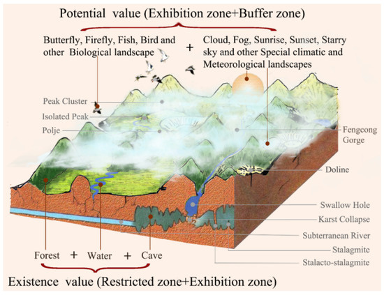 Particular and stable forest ecosystems, natural biological resource gene banks, and unique hydrogeological binary structures constitute the background value of the Libo Karst (Figure 6). As they are the intrinsic value of the site, these underlying values should be strictly and permanently protected and not threatened or damaged. Simultaneously, we should exhibit and utilize the existing value by using various measures and technologies.