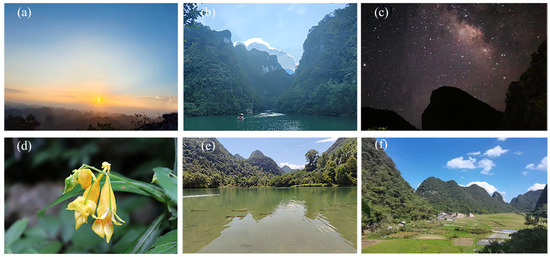 Potential aesthetic value of the Libo Karst: (a) Sunset landscape; (b) Exceptional meteorological landscape; (c) Starry sky landscape; (d,e) Biological landscape; (f) Landscape of the harmony between human beings and nature.