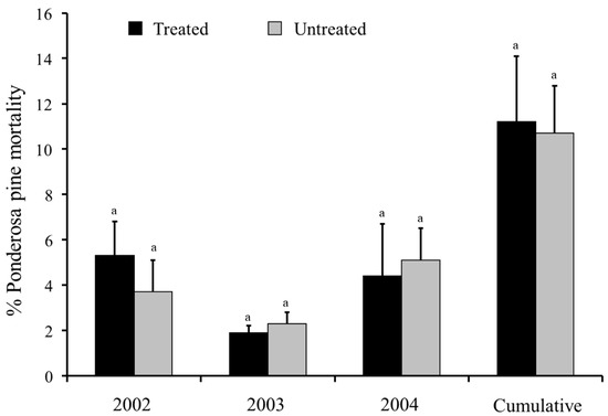 Mean percentages (+SEM) of ponderosa pines (Pinus ponderosa) killed by western pine beetle (Dendroctonus brevicomis) in verbenone-treated and untreated plots, California. Bars preceded by the same letter within year and cumulatively (2002–2004) are not significantly different (p > 0.05; Tukey’s HSD). Adapted from Fettig et al. [57].