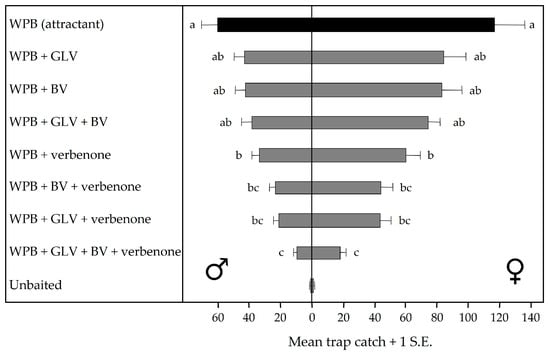 Daily captures of western pine beetle (Dendroctonus brevicomis) in multiple-funnel traps baited with an attractant (WPB), or with an attractant and green leaf volatile blend (GLV), bark volatile blend (BV), nonhost angiosperm volatile blend (GLV + BV), and verbenone, California. Bars preceded (for males) and followed (for females) by the same letter are not significantly different (n = 30; Tukey’s HSD; p > 0.05). Adapted from Fettig et al. [40].