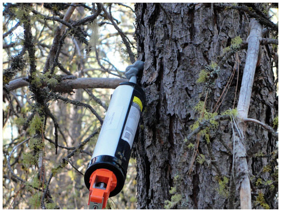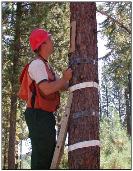 Tree baits may be used for a variety of experimental purposes. The most common purpose is baiting of host trees to test the efficacy of semiochemical repellents (e.g., [56,57,58,59]) or insecticides (e.g., [60,61]) for tree protection. It is rare for a high proportion (>30%) of unbaited host trees to be attacked by western pine beetles in any given year, and if trees are not baited investigators run the risk of few experimental trees being challenged (attacked) by beetles. Typically, repellents or insecticides (and a control) are randomly assigned to 20–30 trees per treatment and later baited with the goal of inducing attack by western pine beetles. Efficacy is based on comparisons of attack densities (e.g., by counting numbers of successful attacks (i.e., oxidized phloem material present in pitch tubes or points of attack containing boring dust and/or dry frass) and unsuccessful attacks (i.e., pitch tubes without oxidized phloem material)) and/or levels of tree mortality among treatments.