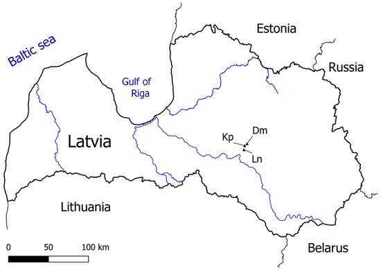 Location of the study sites in conifer forests with mesotrophic (Dm), eutrophic (Kp) and oligotrophic (Ln) conditions in Latvia.