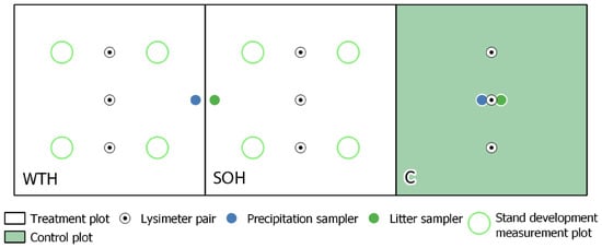 Each study site was divided into two treatment plots and a control plot (Figure 2). In the control plots, the forest stand was left intact without any disturbance. The treatment plots tested two harvest intensities—stem-only harvesting (SOH) and whole-tree harvesting (WTH). Only tree stems were harvested in the SOH plots, while all above-ground tree biomass was harvested in the WTH plots. Both employed treatments correspond to ground-based cut-to-length harvesting system (as, for example, in Nurminen et al. [32] and Lundbäck et al. [33]), with logging residues collected from WTH plots afterwards.