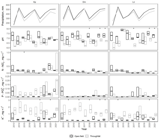 Total precipitation and general chemistry during the vegetation season (May–October) collected in the open field (harvested area) and under the tree canopy (throughfall in control stand) at the study sites. Boxplots indicate 25%, median and 75% quartiles; stars indicate significant differences between open field and throughfall precipitation (p < 0.05).